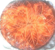 Prendre un disque de pâte, le soulever plusieurs fois et le laisser retomber sur le plan de travail comme ç'à la pâte ne se rétracte pas à la cuisson mais sur le plan de travail - Si vous devez l'étendre au rouleau (bloc de pâte faîte par vous), fleurer le plan de travail avec du sucre poudre au lieu de farine (le croustillant de la pâte sera nettement amélioré) et découper 2 disques de 24 cm de diamètre en vous aidant d'une assiette comme gabarit - Disposer les pommes en rosace en laissant un bord assez large pour souder l'autre pâte - Verser le restant de jus de cuisson - Mettre la fève. Au pinceau, mouiller tout le bord de la pâte. Couvrir avec l'autre disque de pâte et bien appuyer sur le tour pour souder - Dorer avec l'oeuf battu - Mettre au congélateur 1 heure.