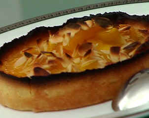 Répartir les fruits sur le fond de tarte cuit avec la frangipane puis napper avec sabayon tiède. Griller sous le grill. Parsemer des amandes effilées et servir immédiatement