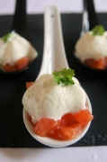 Dresser une petite quenelle de mousse de poireaux dans les cuillères