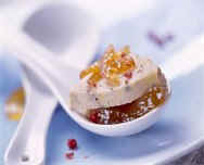 Déposer dans le fond de la cuillère un peu de compotée d'oignons. Ajouter un copeau de foie gras. Mettre sur le dessus des amandes concassées.