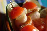 Pelez à vif les pamplemousses et les citrons, puis récupérez les quartiers des agrumes. Réalisez les brochettes en commençant par une tomate cerise, puis en alternant pétoncles et quartiers d'agrumes, terminez par une tomate cerise, saupoudrez de piment. Déposez les brochettes dans un plat et cuisez-les dans un four chaud (180°, thermostat 6) pendant 8 à 10 min. Servez chaud.
