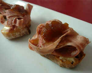 Coupez 20 fines tranches de ficelle et faites-les griller au four. Laissez refroidir les toasts avant de les tartiner de beurre. Déstructurez les tranches d'andouille afin de ne plus avoir que des filaments. Garnissez chaque toast d'une petite montagne de spaghettis d'andouille. Déposez au sommet un peu de confit d'oignons