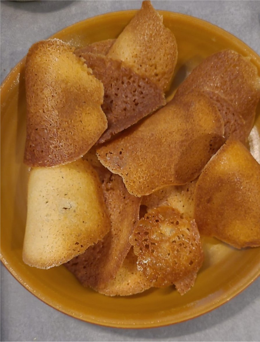 Cuire pendant environ 6 mn à four 200°. Sortir du four, dès la coloration attendue. Attendre 1 mn pour les décoller et les poser sur un rouleau à patisserie pour leur donner la forme.