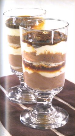 Dresser dans un verre selon l'ordre suivant : Crème chocolat, streusel en miettes, fruits, crème vanille. Recouvrir d'un film plastique et réserver au frais une vingtaine d'heures.