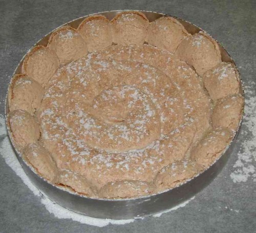 Faire des macarons le long du cercle puis une spirale à l'intérieur. Rectifier avec une cuillère s'il y a quelques trous.