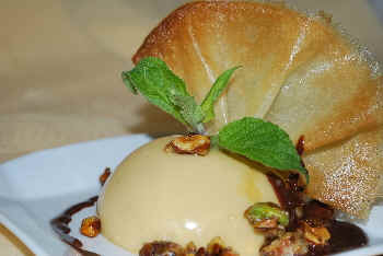 Fond de meringue émiettée - appareil parfait de chocolat - coulis de kiwi légèrement sucré au sucre glace. On a un contraste entre le craquant de la meringue et l'onctuosité du chocolat. Le coulis de kiwi apporte une note acidulée et poivrée très agréable. Le coulis de kiwi peut être remplacé par du coulis de framboise ou de fraise avec ou sans feuille de menthe fraîche.