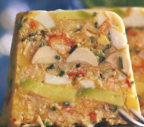 Tapisser une terrine de film alimentaire. Aligner la moitié des lamelles d'avocat et de coeurs de palmier. Combler les espaces avec la farce au crabe. Renouveler l'opération en terminant par de la farce. Couvrir et réserver pendant 12h au frigo.