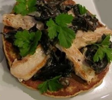 Dresser l'assiette en déposant quelques aiguillettes sur le pancake, ajouter les champignons avec un peu de sauce et terminer par le persil plat.