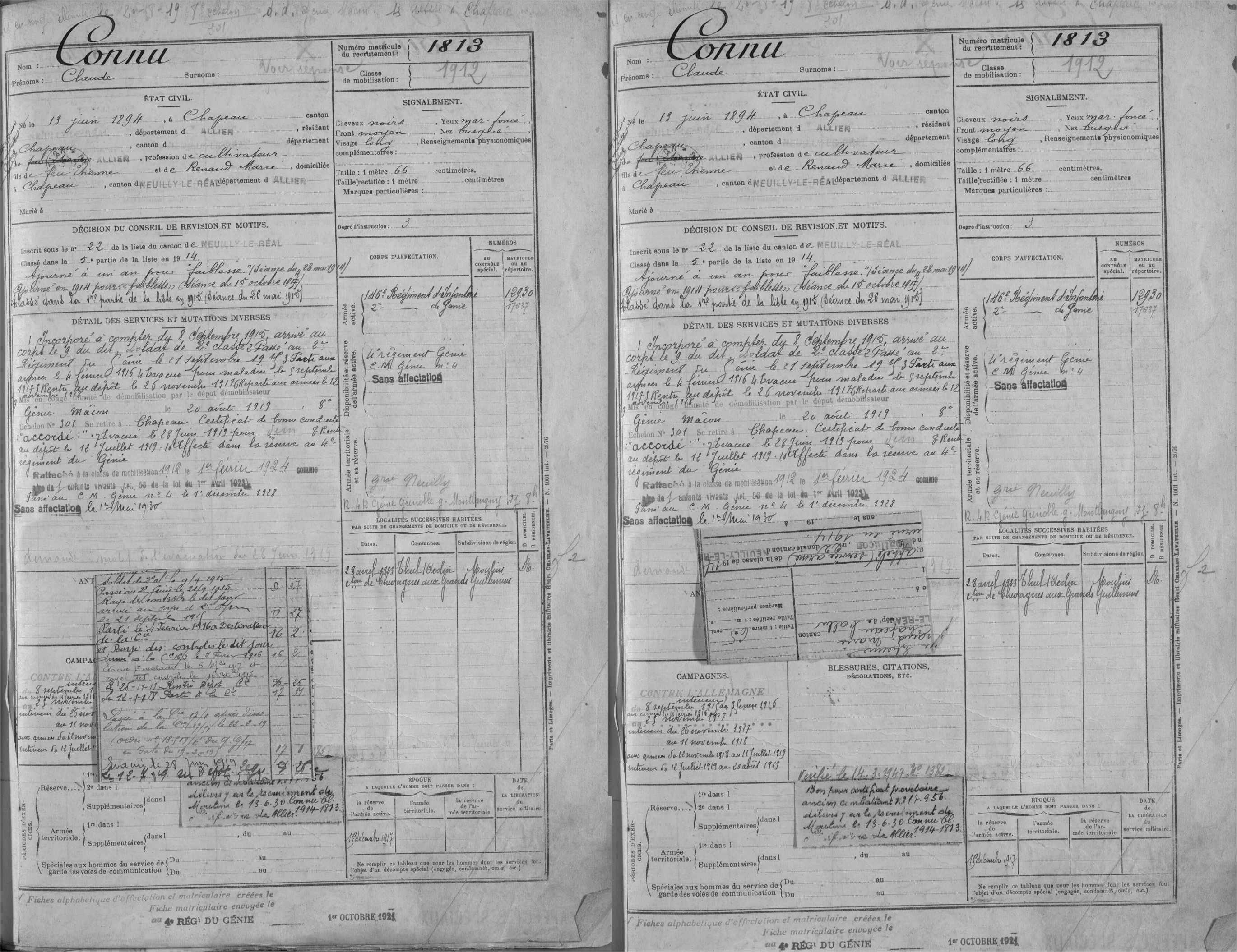 Exemple de fiche militaire, la fiche militaire de CONNU Claude né en 1894 à Chapeau (fiche matricule n°1813, bureau de Moulins)