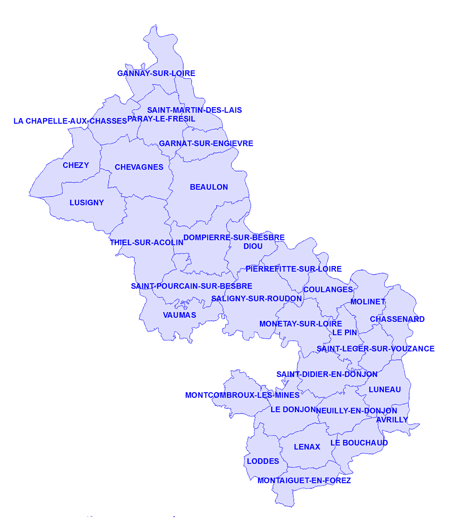 Le canton n° 5 de Dompierre comprend les communes suivantes : Avrilly, Beaulon, Le Bouchaud, La Chapelle-aux-Chasses, Chassenard, Chevagnes, Chézy, Coulanges, Diou, Dompierre-sur- Besbre, Le Donjon, Gannay-sur-Loire, Garnat-sur-Engièvre, Lenax, Loddes, Luneau, Lusigny, Molinet, Monétay-sur-Loire, Montaiguët-en-Forez, Montcombroux-les-Mines, Neuilly-en-Donjon, Paray-le-Frésil, Pierrefitte-sur-Loire, Le Pin, Saint-Didier-en-Donjon, Saint-Léger-sur-Vouzance, Saint-Martin-des-Lais, Saint-Pourçain-sur-Besbre, Saligny-sur-Roudon, Thiel-sur-Acolin, Vaumas