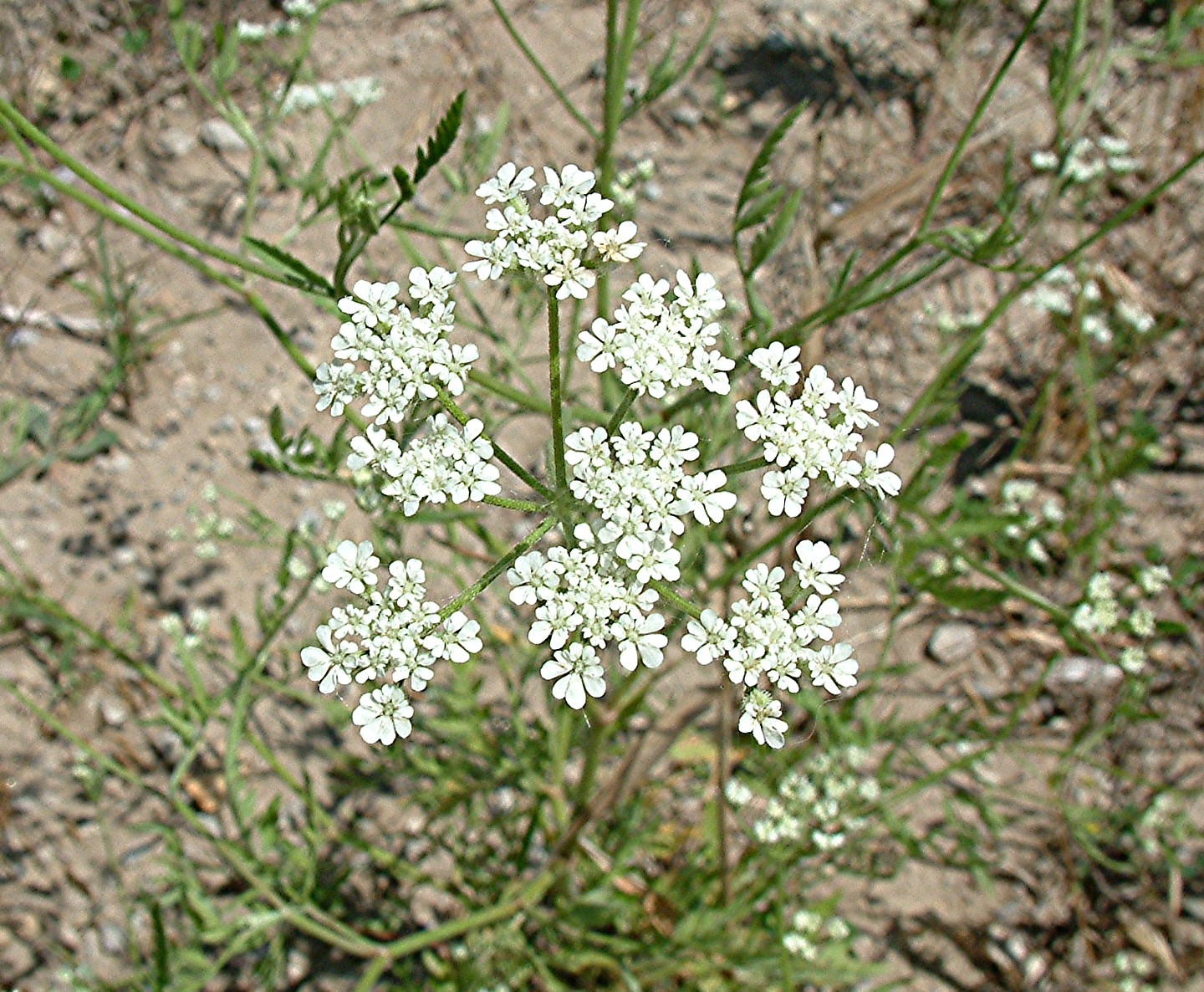 | Noms régionaux : torilis des champs Données botaniques : plante annuelle. Famille des Apiacées. Feuilles : long pétiole poilu. Feuilles couvertes de poils. Tiges : rondes et érigées. Fleurs : blanches en ombelles. Floraison : de juillet à septembre Fruits : oviformes à épines droites. Reproduction : par graines. Cycle : annuel Type de sol : sols argilo-calcaires, plutôt secs. Région : partout